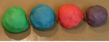 Divida a massa em algumas partes. Em cada parte coloque uma colher de sopa de tinta guache diluída em um pouco de água (em cada parte uma cor diferente). Amasse até a tinta estar espalhada igualmente.